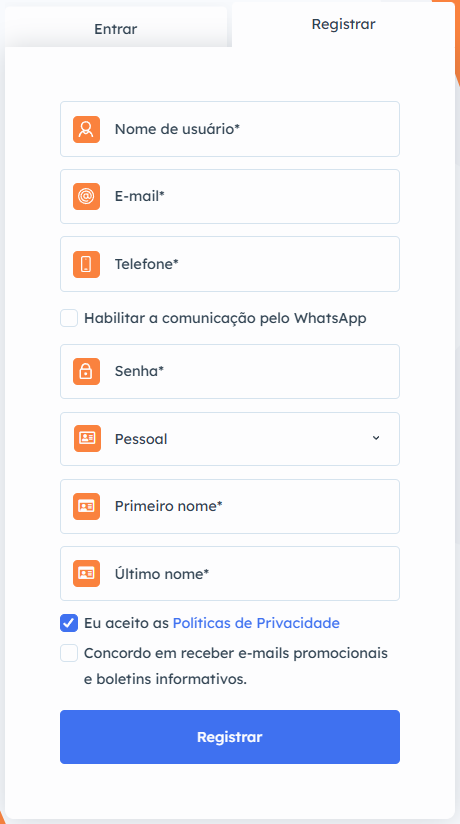 - Eu aceito as Políticas de Privacidade: Você precisa assinalar essa opção para realizar o cadastro;