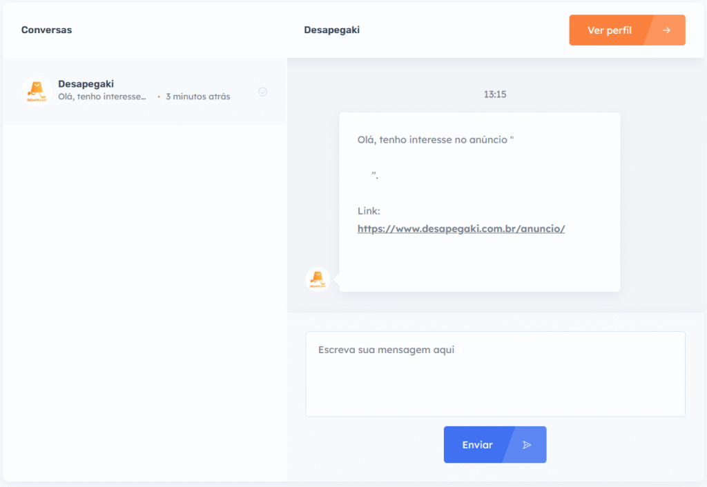 O menu de Mensagens é destinado a centralizar a comunicação que acontece entre comprador e anunciante. Essa mensagem é enviada pelo interessado ao clicar no botão de “Chat” presente no seu anúncio.