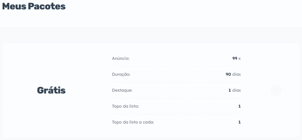 - Anúncio: É a quantidade de anúncios que você pode criar com esse pacote. Sempre que você publica um anúncio esse valor é subtraído;